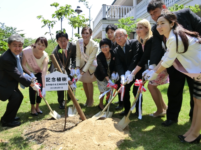 全米さくらの女王一行は、鈴木健一伊勢市長への表敬訪問、皇學館大學での文化交流ののち、尾崎咢堂記念館を訪問し、ハナミズキの記念植樹式に臨んだ。「咢堂香風」のメンバーは、全米さくらの女王の訪問に合わせて、今年4月に実施したさくら絵画コンクールの出品作品を館内の壁一面に展示し、満開の桜を演出していた。「尾崎咢堂記念館では、ここ伊勢でお迎えした歴代の全米さくらの女王に、館内の庭園に桜又はハナミズキの木を植樹いただいています。全米さくらの女王によって植樹された木は、尾崎行雄ゆかりの日米親善のシンボルとして永遠に大切に育てられていくことでしょう。ここでは、ベルヘルストさんはいつお越しいただいても全米さくらの女王です。ベルヘルストさんをはじめ、歴代の全米さくらの女王が、木の成長を見に近い将来ここに戻ってこられることを心から楽しみにしています。」と奥本謙造館長は語った。